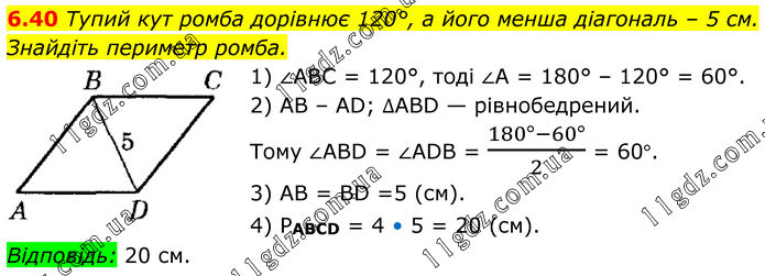 6.40 Тупий кут ромба дорівнює 120°, а його менша діагональ – 5 см. Знайдіть периметр ромба. 1) ∠ABC = 120°, тоді ∠A = 180° – 120° = 60°. 2) AB – AD; ∆ABD — рівнобедрений. Тому ∠ABD = ∠ADB = (180°-60°)/2 = 60°. 3) AB = BD =5 (см). 4) РАBCD = 4 • 5 = 20 (см). Відповідь: 20 см.