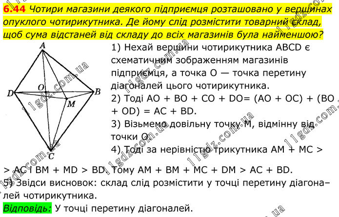 6.44 Чотири магазини деякого підприємця розташовано у вершинах опуклого чотирикутника. Де йому слід розмістити товарний склад, щоб сума відстаней від складу до всіх магазинів була найменшою? 1) Нехай вершини чотирикутника ABCD є схематичним зображенням магазинів підприємця, а точка O — точка перетину діагоналей цього чотирикутника. 2) Тоді AO + BO + CO + DO= (AO + OC) + (BO + OD) = AC + BD. 3) Візьмемо довільну точку М, відмінну від точки О. 4) Тоді за нерівністю трикутника AM + MC > > AC і BM + MD > BD. Тому AM + BM + MC + DM > AC + BD. 5) Звідси висновок: склад слід розмістити у точці перетину діагона–лей чотирикутника. Відповідь: У точці перетину діагоналей.