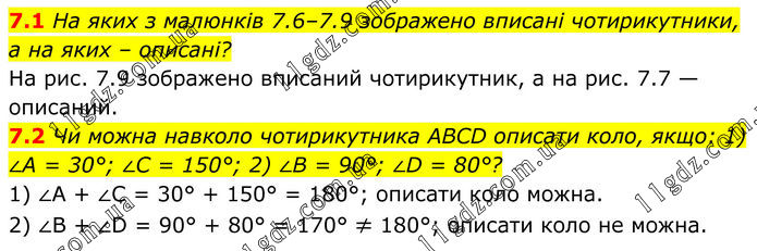 7.1 На яких з малюнків 7.6–7.9 зображено вписані чотирикутники, а на яких – описані? На рис. 7.9 зображено вписаний чотирикутник, а на рис. 7.7 — описаний. 7.2 Чи можна навколо чотирикутника ABCD описати коло, якщо: 1) ∠A = 30°; ∠C = 150°; 2) ∠B = 90°; ∠D = 80°? 1) ∠A + ∠C = 30° + 150° = 180°; описати коло можна. 2) ∠B + ∠D = 90° + 80° = 170° ≠ 180°; описати коло не можна.