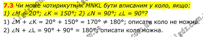7.3 Чи може чотирикутник MNKL бути вписаним у коло, якщо: 1) ∠M = 20°; ∠K = 150°; 2) ∠N = 90°; ∠L = 90°? 1) ∠M + ∠K = 20° + 150° = 170° ≠ 180°; описати коло не можна. 2) ∠N + ∠L = 90° + 90° = 180°; описати коло можна.