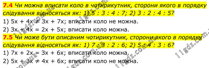 7.4 Чи можна вписати коло в чотирикутник, сторони якого в порядку слідування відносяться як: 1) 5 : 3 : 4 : 7; 2) 3 : 2 : 4 : 5? 1) 5х + 4х ≠ Зх + 7х; вписати коло не можна. 2) Зх + 4х = 2х + 5х; вписати коло можна. 7.5 Чи може бути описаним чотирикутник, сторони якого в порядку слідування відносяться як: 1) 7 : 3 : 2 : 6; 2) 5 : 4 : 3 : 6? 1) 7х + 2х = Зх + 6х; вписати коло можна. 2) 5х + Зх ≠ 4х + 6х; вписати коло не можна.