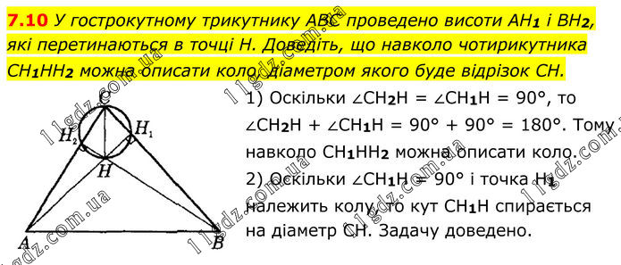 7.10 У гострокутному трикутнику ABC проведено висоти AH1 і BH2, які перетинаються в точці H. Доведіть, що навколо чотирикутника CH1HH2 можна описати коло, діаметром якого буде відрізок CH. 1) Оскільки ∠CH2H = ∠CH1H = 90°, то ∠CH2H + ∠CH1H = 90° + 90° = 180°. Тому навколо CH1HH2 можна описати коло. 2) Оскільки ∠CH1H = 90° і точка H1 належить колу, то кут CH1H спирається на діаметр CH. Задачу доведено.