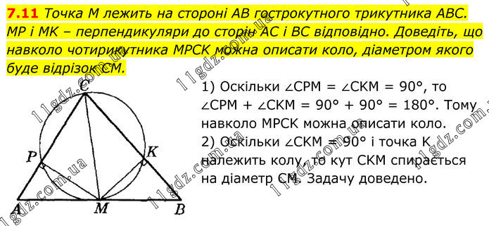7.11 Точка M лежить на стороні AB гострокутного трикутника ABC. MP і MK – перпендикуляри до сторін AC і BC відповідно. Доведіть, що навколо чотирикутника MPCK можна описати коло, діаметром якого буде відрізок CM. 1) Оскільки ∠CPM = ∠CKM = 90°, то ∠CPM + ∠CKM = 90° + 90° = 180°. Тому навколо MPCK можна описати коло. 2) Оскільки ∠CKM = 90° і точка K належить колу, то кут CKM спирається на діаметр CM. Задачу доведено.