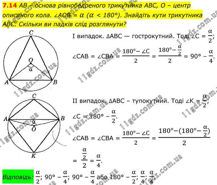 7.14 AB – основа рівнобедреного трикутника ABC, O – центр описаного кола. ∠AOB = α (α < 180°). Знайдіть кути трикутника ABC. Скільки ви падків слід розглянути? І випадок. ∆ABC — гострокутний. Тоді ∠С = α/2; ∠САВ = ∠СВА = (180°- ∠С)/2 = (180°- α/2)/2 = 90° – α/4. II випадок. ∆ABC – тупокутний. Тоді ∠K = α/2; ∠С = 180° – α/2. ∠САВ = ∠СВА = (180°- ∠С)/2 = (180°-(180°- α/2))/2 = (α/2)/2 = α/4. Відповідь: α/2; 90° – α/4; 90° – α/4 або 180° – α/2; α/4; α/4.