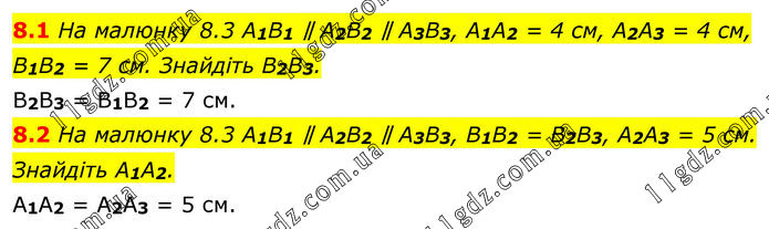 8.1 На малюнку 8.3 A1В1 ∥ A2В2 ∥ A3B3, A1A2 = 4 см, A2A3 = 4 см, B1B2 = 7 см. Знайдіть B2B3. B2B3 = B1B2 = 7 см. 8.2 На малюнку 8.3 A1B1 ∥ A2B2 ∥ A3B3, B1B2 = B2B3, A2A3 = 5 см. Знайдіть A1A2. A1A2 = A2A3 = 5 см.