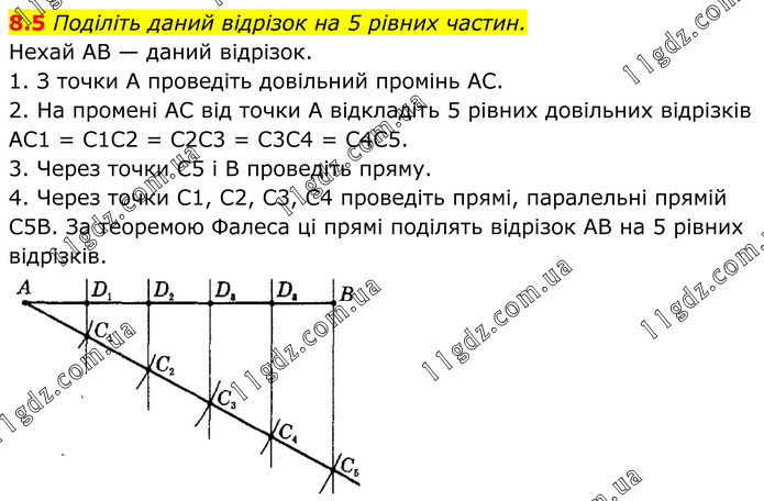 8.5 Поділіть даний відрізок на 5 рівних частин. Нехай АВ — даний відрізок. 1. З точки А проведіть довільний промінь АС. 2. На промені АС від точки А відкладіть 5 рівних довільних відрізків АС1 = С1С2 = С2С3 = С3С4 = С4С5. 3. Через точки С5 і В проведіть пряму. 4. Через точки С1, С2, С3, С4 проведіть прямі, паралельні прямій С5В. За теоремою Фалеса ці прямі поділять відрізок АВ на 5 рівних відрізків.