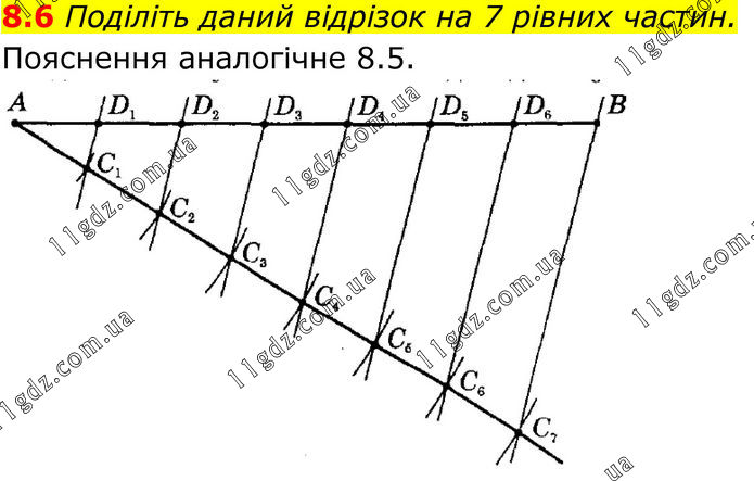 8.6 Поділіть даний відрізок на 7 рівних частин. Пояснення аналогічне 8.5.