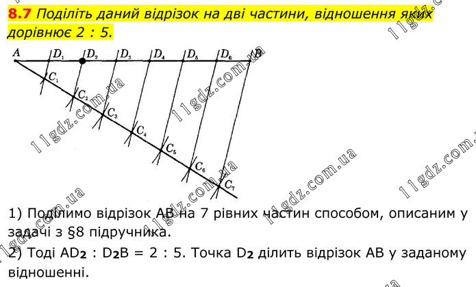 8.7 Поділіть даний відрізок на дві частини, відношення яких дорівнює 2 : 5. 1) Поділимо відрізок AB на 7 рівних частин способом, описаним у задачі з §8 підручника. 2) Тоді AD2 : D2B = 2 : 5. Точка D2 ділить відрізок AB у заданому відношенні.