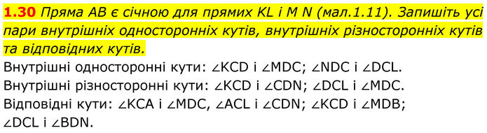 Пряма AB є січною для прямих KL і M N (мал.1.11). Запишіть усі пари внутрішніх односторонніх кутів, внутрішніх різносторонніх кутів та відповідних кутів. Внутрішні односторонні кути: ∠KCD і ∠MDC; ∠NDC і ∠DCL. Внутрішні різносторонні кути: ∠KCD і ∠CDN; ∠DCL і ∠MDC. Відповідні кути: ∠KCA і ∠MDC, ∠ACL і ∠CDN; ∠KCD і ∠MDB; ∠DCL і ∠BDN.