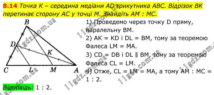 8.14 Точка K – середина медіани AD трикутника ABC. Відрізок BK перетинає сторону AC у точці M. Знайдіть AM : MC. 1) Проведемо через точку D пряму, паралельну BM. 2) AK = KD і DL = BM, тому за теоремою Фалеса LM = MA. 3) CD = DB і DL ∥ BM, тому за теоремою Фалеса CL = LM. 4) Отже, CL = LM = MA, а тому AM : MC = 1 : 2. Відповідь: 1 : 2.