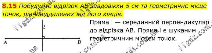 8.15 Побудуйте відрізок АВ завдовжки 5 см та геометричне місце точок, рівновіддалених від його кінців. Пряма l — серединний перпендикуляр до відрізка AB. Пряма l є шуканим геометричним місцем точок.