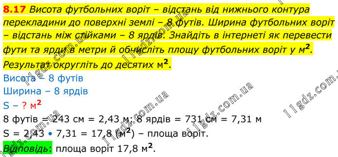 8.17 Висота футбольних воріт – відстань від нижнього контура перекладини до поверхні землі – 8 футів. Ширина футбольних воріт – відстань між стійками – 8 ярдів. Знайдіть в інтернеті як перевести фути та ярди в метри й обчисліть площу футбольних воріт у м2. Результат округліть до десятих м2. Висота – 8 футів Ширина – 8 ярдів S – ? м2 8 футів = 243 см = 2,43 м; 8 ярдів = 731 см = 7,31 м. S = 2,43 • 7,31 = 17,8 (м2) – площа воріт. Відповідь: площа воріт 17,8 м2.