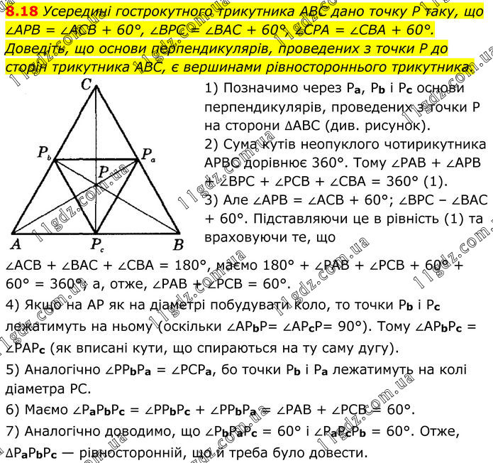 8.18 Усередині гострокутного трикутника ABC дано точку P таку, що ∠APB = ∠ACB + 60°, ∠BPC = ∠BAC + 60°, ∠CPA = ∠CBA + 60°. Доведіть, що основи перпендикулярів, проведених з точки P до сторін трикутника ABC, є вершинами рівностороннього трикутника. 1) Позначимо через Pa, Pb і Pc основи перпендикулярів, проведених з точки P на сторони ∆ABC (див. рисунок). 2) Сума кутів неопуклого чотирикутника APBC дорівнює 360°. Тому ∠PAB + ∠APB + ∠BPC + ∠PCB + ∠CBA = 360° (1). 3) Але ∠APB = ∠ACB + 60°; ∠BPC – ∠BAC + 60°. Підставляючи це в рівність (1) та враховуючи те, що ∠ACB + ∠BAC + ∠CBA = 180°, маємо 180° + ∠PAB + ∠PCB + 60° + 60° = 360°; а, отже, ∠PAB + ∠PCB = 60°. 4) Якщо на AP як на діаметрі побудувати коло, то точки Pb і Pc лежатимуть на ньому (оскільки ∠APbP= ∠APcP= 90°). Тому ∠APbPc = ∠PAPc (як вписані кути, що спираються на ту саму дугу). 5) Аналогічно ∠PPbPa = ∠PCPa, бо точки Pb і Pa лежатимуть на колі діаметра PC. 6) Маємо ∠PaPbPc = ∠PPbPc + ∠PPbPa = ∠PAB + ∠PCB = 60°. 7) Аналогічно доводимо, що ∠PbPaPc = 60° і ∠PaPcPb = 60°. Отже, ∆PaPbPc — рівносторонній, що й треба було довести.