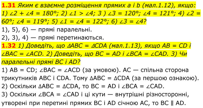 1.31 Яким є взаємне розміщення прямих а і b (мал.1.12), якщо: 1) ∠2 + ∠4 = 180°; 2) ∠1 > ∠4; 3 ) ∠3 = 120°; ∠4 = 121°; 4) ∠2 = 60°; ∠4 = 119°; 5) ∠1 = ∠4 = 122°; 6) ∠3 = ∠4? 1), 5), 6) — прямі паралельні. 2), 3), 4) — прямі перетинаються. 1.32 1) Доведіть, що ∆ABC = ∆CDA (мал.1.13), якщо AB = CD і ∠BAC = ∠ACD. 2) Доведіть, що BC = AD і ∠BCA = ∠CAD. 3) Чи паралельні прямі BC і AD? 1) AB = CD; ∠BAC = ∠ACD (за умовою). AC — спільна сторона трикутників ABC і CDA. Тому ∆ABC = ∆CDA (за першою ознакою). 2) Оскільки ∆ABC = ∆CDA, то BC = AD і ∠BCA = ∠CAD. 3) Оскільки ∠BCA = ∠CAD і ці кути — внутрішні різносторонні, утворені при перетині прямих BC і AD січною AC, то BC ∥ AD.