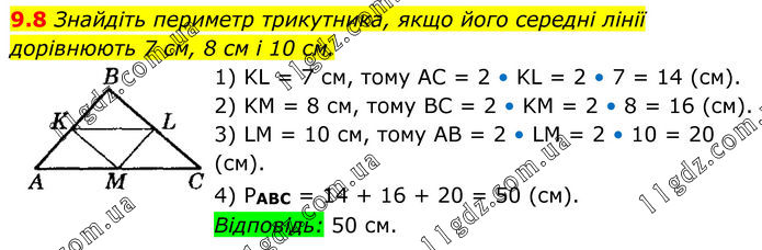 9.8 Знайдіть периметр трикутника, якщо його середні лінії дорівнюють 7 см, 8 см і 10 см. 1) KL = 7 см, тому AC = 2 • KL = 2 • 7 = 14 (см). 2) KM = 8 см, тому BC = 2 • KM = 2 • 8 = 16 (см). 3) LM = 10 см, тому AB = 2 • LM = 2 • 10 = 20 (см). 4) PАВС = 14 + 16 + 20 = 50 (см). Відповідь: 50 см.