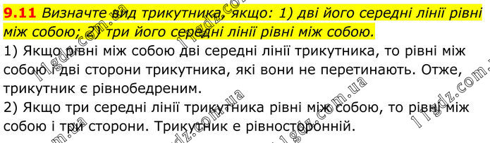 9.11 Визначте вид трикутника, якщо: 1) дві його середні лінії рівні між собою; 2) три його середні лінії рівні між собою. 1) Якщо рівні між собою дві середні лінії трикутника, то рівні між собою і дві сторони трикутника, які вони не перетинають. Отже, трикутник є рівнобедреним. 2) Якщо три середні лінії трикутника рівні між собою, то рівні між собою і три сторони. Трикутник е рівносторонній.