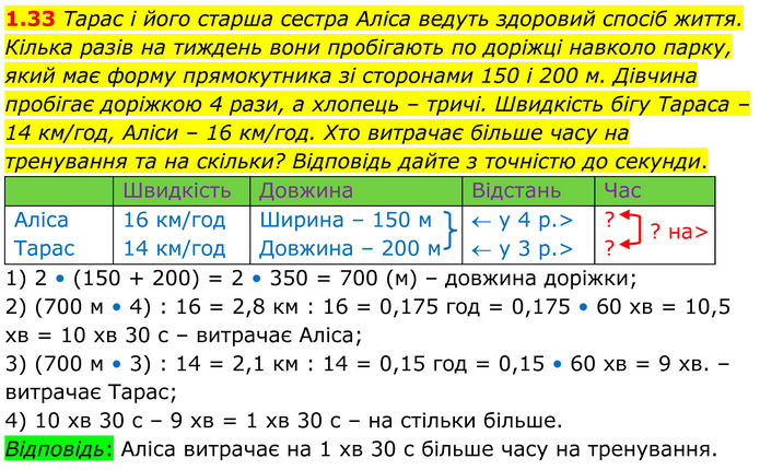 Тарас і його старша сестра Аліса ведуть здоровий спосіб життя. Кілька разів на тиждень вони пробігають по доріжці навколо парку, який має форму прямокутника зі сторонами 150 і 200 м. Дівчина пробігає доріжкою 4 рази, а хлопець – тричі. Швидкість бігу Тараса – 14 км/год, Аліси – 16 км/год. Хто витрачає більше часу на тренування та на скільки? Відповідь дайте з точністю до секунди. 1) 2 • (150 + 200) = 2 • 350 = 700 (м) – довжина доріжки; 2) (700 м • 4) : 16 = 2,8 км : 16 = 0,175 год = 0,175 • 60 хв = 10,5 хв = 10 хв 30 с – витрачає Аліса; 3) (700 м • 3) : 14 = 2,1 км : 14 = 0,15 год = 0,15 • 60 хв = 9 хв. – витрачає Тарас; 4) 10 хв 30 с – 9 хв = 1 хв 30 с – на стільки більше. Відповідь: Аліса витрачає на 1 хв 30 с більше часу на тренування.