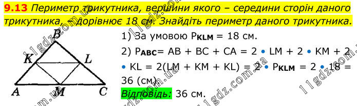 9.13 Периметр трикутника, вершини якого – середини сторін даного трикутника, – дорівнює 18 см. Знайдіть периметр даного трикутника. 1) За умовою PKLM = 18 см. 2) PABC= AB + BC + CA = 2 • LM + 2 • KM + 2 • KL = 2(LM + KM + KL) = 2 • PKLM = 2 • 18 = 36 (см). Відповідь: 36 см.