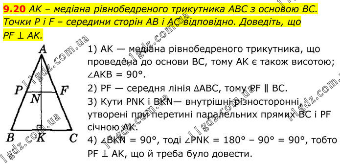 9.20 AK – медіана рівнобедреного трикутника ABC з основою BC. Точки P і F – середини сторін AB і AC відповідно. Доведіть, що PF ⊥ AK. 1) AK — медіана рівнобедреного трикутника, що проведена до основи BC, тому AK є також висотою; ∠AKB = 90°. 2) PF — середня лінія ∆ABC, тому PF ∥ BC. 3) Кути PNK i BKN— внутрішні різносторонні, утворені при перетині паралельних прямих BC і PF січною AK. 4) ∠BKN = 90°, тоді ∠PNK = 180° – 90° = 90°, тобто PF ⊥ AK, що й треба було довести.