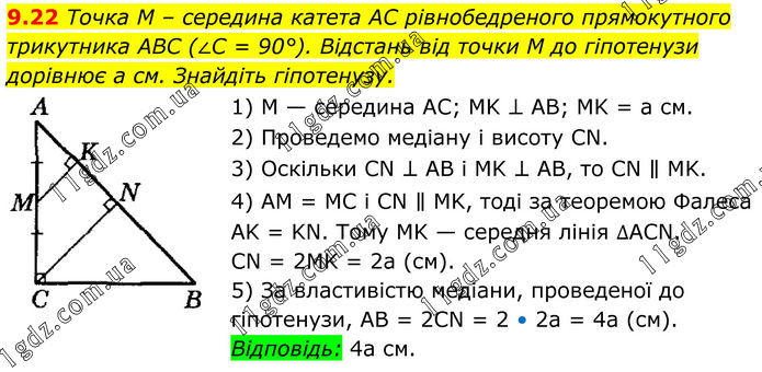 9.22 Точка M – середина катета AC рівнобедреного прямокутного трикутника ABC (∠C = 90°). Відстань від точки M до гіпотенузи дорівнює а см. Знайдіть гіпотенузу. 1) M — середина AC; MK ⊥ AB; MK = а см. 2) Проведемо медіану і висоту CN. 3) Оскільки CN ⊥ AB і MK ⊥ AB, то CN ∥ MK. 4) AM = MC і CN ∥ MK, тоді за теоремою Фалеса AK = KN. Тому MK — середня лінія ∆ACN. CN = 2MK = 2а (см). 5) За властивістю медіани, проведеної до гіпотенузи, AB = 2CN = 2 • 2а = 4а (см). Відповідь: 4а см.