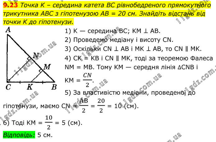 9.23 Точка K – середина катета BC рівнобедреного прямокутного трикутника ABC з гіпотенузою AB = 20 см. Знайдіть відстань від точки K до гіпотенузи. 1) K — середина BC; KM ⊥ AB. 2) Проведемо медіану і висоту CN. 3) Оскільки CN ⊥ AB і MK ⊥ AB, то CN ∥ MK. 4) CK = KB i CN ∥ MK, тоді за теоремою Фалеса NM = MB. Тому KM — середня лінія ∆CNB і KM = CN/2. 5) За властивістю медіани, проведеної до гіпотенузи, маємо CN = AB/2 = 20/2 = 10 (см). 6) Тоді KM = 10/2 = 5 (см). Відповідь: 5 см.