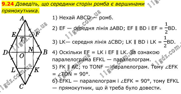 9.24 Доведіть, що середини сторін ромба є вершинами прямокутника. 1) Нехай ABCD — ромб. 2) EF — середня лінія ∆ABD; EF ∥ BD i EF = 1/2BD. 3) LK— середня лінія ∆CBD; LK ∥ BD і LK = 1/2BD. 4) Оскільки EF = LK i EF ∥ LK. За ознакою паралелограма EFKL — паралелограм. 5) FK ∥ AC; то TONF — паралелограм. Тому ∠EFK = ∠TON = 90°. 6) EFKL — паралелограм і ∠EFK = 90°, тому EFKL — прямокутник, що й треба було довести.
