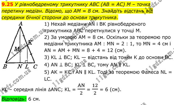 9.25 У рівнобедреному трикутнику ABC (AB = AC) M – точка перетину медіан. Відомо, що AM = 8 см. Знайдіть відстань від середини бічної сторони до основи трикутника. 1) Нехай медіани AN і BK рівнобедреного трикутника ABC перетнулися у точці М. 2) За умовою AM = 8 см. Оскільки за теоремою про медіани трикутника AM : MN = 2 : 1, то MN = 4 см і AN = AM + MN = 8 + 4 = 12 (см). 3) KL ⊥ BC; KL — відстань від точки K до основи BC. 4) AN ⊥ BC; KL ⊥ BC, тому AN ∥ KL. 5) AK = KC і AN ∥ KL. Тоді за теоремою Фалеса NL = LC. KL – середня лінія ∆ANC; KL = AN/2 = 12/2 = 6 (см). Відповідь: 6 см.