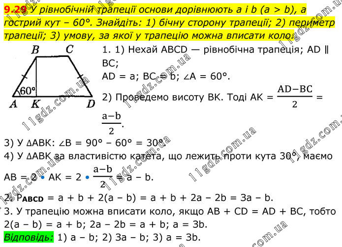 9.29 У рівнобічній трапеції основи дорівнюють а і b (а > b), а гострий кут – 60°. Знайдіть: 1) бічну сторону трапеції; 2) периметр трапеції; 3) умову, за якої у трапецію можна вписати коло. 1. 1) Нехай ABCD — рівнобічна трапеція; AD ∥ BC; AD = a; BC = b; ∠A = 60°. 2) Проведемо висоту BK. Тоді AK = (AD-BC)/2 = (a-b)/2. 3) У ∆АВК: ∠B = 90° – 60° = 30°. 4) У ∆ABK за властивістю катета, що лежить проти кута 30°, маємо AB = 2 • AK = 2 • (a-b)/2 = a – b. 2. PABCD = а + b + 2(а – b) = а + b + 2а – 2b = За – b. 3. У трапецію можна вписати коло, якщо AB + CD = AD + BC, тобто 2(а – b) = а + b; 2а – 2b = а + b; а = Зb. Відповідь: 1) а – b; 2) За – b; 3) а = Зb.