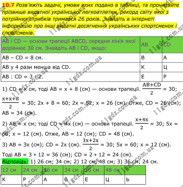 10.7 Розв’яжіть задачі, умови яких подано в таблиці, та прочитайте прізвище видатної української легкоатлетки, рекорд світу якої з потрійних стрибків тримався 26 років. Знайдіть в інтернеті інформацію про інші видатні досягнення українських спортсменок і спортсменів. AB і CD — основи трапеції ABCD, середня лінія якої дорівнює 30 см. Знайдіть AB і CD, якщо: AB CD AB – CD = 8 см. В А AB у 4 рази менша від CD. K Ц AB : CD = 3 : 2. E P 1) СD = х см, тоді AB = х + 8 (см) — основи трапеції. (AB+CD)/2 = 30; (x+x+8)/2 = 30; 2х + 8 = 60; 2х = 52; х = 26 (см). Отже, CD = 26 (см); AB = 34 (см). 2) АВ = х см; тоді CD = 4х (см) — основи трапеції. (x+4x)/2 = 30; 5х = 60; х = 12 (см). Отже, AB = 12 (см); CD = 48 (см). 3) AB = Зх (см); CD = 2х (см). (3x+2x)/2 = 30; 5х = 60; х = 12 (см). Тоді AB = 3 • 12 = 36 (см); CD = 2 • 12 = 24 (см). Відповідь: 1) 26 см; 34 см; 2) 12 см; 48 см; 3) 36 см; 24 см.