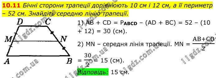 10.11 Бічні сторони трапеції дорівнюють 10 см і 12 см, а її периметр – 52 см. Знайдіть середню лінію трапеції. 1) AB + CD = PABCD – (AD + BC) = 52 – (10 + 12) = 30 (см). 2) MN – середня лінія трапеції. MN = (AB+CD)/2 = 30/2 = 15 (см). Відповідь: 15 см.