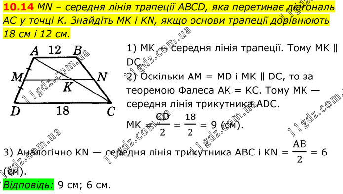 10.14 MN – середня лінія трапеції ABCD, яка перетинає діагональ AC у точці K. Знайдіть MK і KN, якщо основи трапеції дорівнюють 18 см і 12 см. 1) MK — середня лінія трапеції. Тому MK ∥ DC. 2) Оскільки AM = MD і MK ∥ DC, то за теоремою Фалеса AK = KC. Тому MK — середня лінія трикутника ADC. MK = CD/2 = 18/2 = 9 (см). 3) Аналогічно KN — середня лінія трикутника ABC i KN = AB/2 = 6 (см). Відповідь: 9 см; 6 см.
