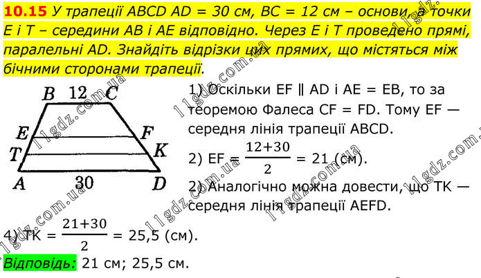 10.15 У трапеції ABCD AD = 30 см, BC = 12 см – основи, а точки E і T – середини AB і AE відповідно. Через E і T проведено прямі, паралельні AD. Знайдіть відрізки цих прямих, що містяться між бічними сторонами трапеції. 1) Оскільки EF ∥ AD і AE = EB, то за теоремою Фалеса CF = FD. Тому EF — середня лінія трапеції ABCD. 2) EF = (12+30)/2 = 21 (см). 3) Аналогічно можна довести, що TK — середня лінія трапеції AEFD. 4) TK = (21+30)/2 = 25,5 (см). Відповідь: 21 см; 25,5 см.