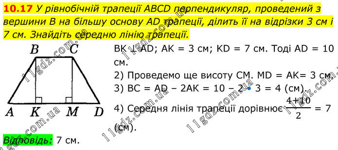 10.17 У рівнобічній трапеції ABCD перпендикуляр, проведений з вершини B на більшу основу AD трапеції, ділить її на відрізки 3 см і 7 см. Знайдіть середню лінію трапеції. BK ⊥ AD; AK = 3 см; KD = 7 см. Тоді AD = 10 см. 2) Проведемо ще висоту CM. MD = AK= 3 см. 3) BC = AD – 2АК = 10 – 2 • 3 = 4 (см). 4) Середня лінія трапеції дорівнює (4+10)/2 = 7 (см). Відповідь: 7 см.