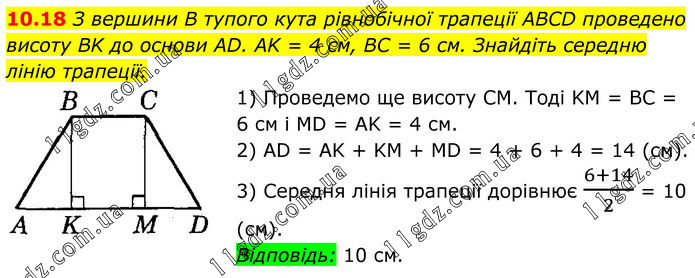 10.18 З вершини B тупого кута рівнобічної трапеції ABCD проведено висоту BK до основи AD. AK = 4 см, BC = 6 см. Знайдіть середню лінію трапеції. 1) Проведемо ще висоту CM. Тоді KM = BC = 6 см і MD = AK = 4 см. 2) AD = AK + KM + MD = 4 + 6 + 4 = 14 (см). 3) Середня лінія трапеції дорівнює (6+14)/2 = 10 (см). Відповідь: 10 см.
