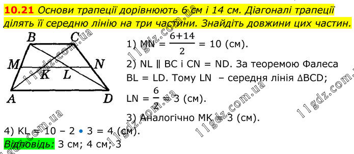 10.21 Основи трапеції дорівнюють 6 см і 14 см. Діагоналі трапеції ділять її середню лінію на три частини. Знайдіть довжини цих частин. 1) MN = (6+14)/2 = 10 (см). 2) NL ∥ BC і CN = ND. За теоремою Фалеса BL = LD. Тому LN – середня лінія ∆BCD; LN = 6/2 = 3 (см). 3) Аналогічно MK = 3 (см). 4) KL = 10 – 2 • 3 = 4 (см). Відповідь: З см; 4 см; 3 см.