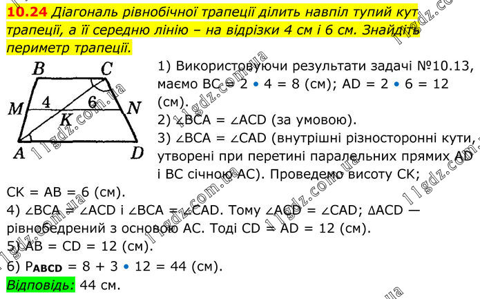 10.24 Діагональ рівнобічної трапеції ділить навпіл тупий кут трапеції, а її середню лінію – на відрізки 4 см і 6 см. Знайдіть периметр трапеції. 1) Використовуючи результати задачі №10.13, маємо BC = 2 • 4 = 8 (см); AD = 2 • 6 = 12 (см). 2) ∠BCA = ∠ACD (за умовою). 3) ∠BCA = ∠CAD (внутрішні різносторонні кути, утворені при перетині паралельних прямих AD і BC січною AC). Проведемо висоту CK; CK = AB = 6 (см). 4) ∠BCA = ∠ACD і ∠BCA = ∠CAD. Тому ∠ACD = ∠CAD; ∆ACD — рівнобедрений з основою AC. Тоді CD = AD = 12 (см). 5) AB = CD = 12 (см). 6) PABCD = 8 + 3 • 12 = 44 (см). Відповідь: 44 см.