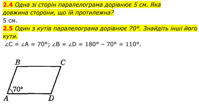 2.4 Одна зі сторін паралелограма дорівнює 5 см. Яка довжина сторони, що їй протилежна? 5 см. 2.5 Один з кутів паралелограма дорівнює 70°. Знайдіть інші його кути. ∠C = ∠A = 70°; ∠B = ∠D = 180° – 70° = 110°.