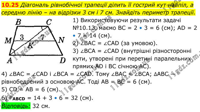 10.25 Діагональ рівнобічної трапеції ділить її гострий кут навпіл, а середню лінію – на відрізки 3 см і 7 см. Знайдіть периметр трапеції. 1) Використовуючи результати задачі №10.13, маємо BC = 2 • 3 = 6 (см); AD = 2 • 7 = 14 (см). 2) ∠BAC = ∠CAD (за умовою). 3) ∠BCA = ∠CAD (внутрішні різносторонні кути, утворені при перетині паралельних прямих AD і BC січною AC). 4) ∠BAC = ∠CAD і ∠BCA = ∠CAD. Тому ∠BAC = ∠BCA; ∆ABC — рівнобедрений з основою AC. Тоді AB = BC = 6 (см). 5) CD = AB = 6 (см). 6) PABCD = 14 + 3 • 6 = 32 (см). Відповідь: 32 см.
