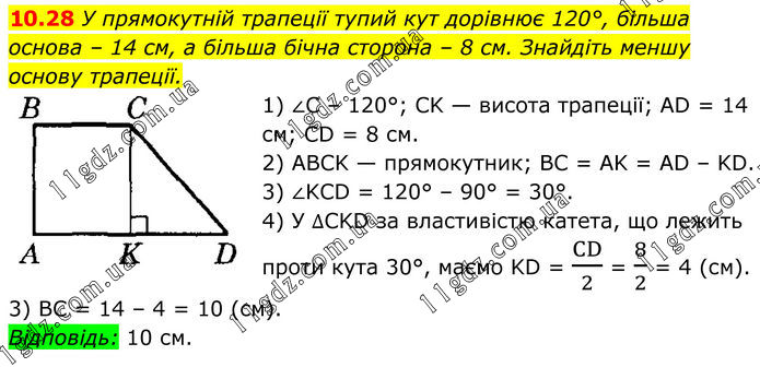 20.28 У прямокутній трапеції тупий кут дорівнює 120°, більша основа – 14 см, а більша бічна сторона – 8 см. Знайдіть меншу основу трапеції. 1) ∠C – 120°; CK — висота трапеції; AD = 14 см; CD = 8 см. 2) ABCK — прямокутник; BC = AK = AD – KD. 3) ∠KCD = 120° – 90° = 30°. 4) У ∆CKD за властивістю катета, що лежить проти кута 30°, маємо KD = CD/2 = 8/2 = 4 (см). 5) BC = 14 – 4 = 10 (см). Відповідь: 10 см.