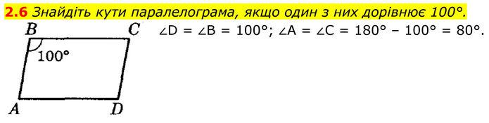 Знайдіть кути паралелограма, якщо один з них дорівнює 100°. ∠D = ∠B = 100°; ∠A = ∠C = 180° – 100° = 80°.