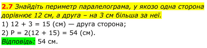 Знайдіть периметр паралелограма, у якозо одна сторона дорівнює 12 см, а друга – на 3 см більша за неї. 1) 12 + 3 = 15 (см) — друга сторона; 2) P = 2(12 + 15) = 54 (см). Відповідь: 54 см.