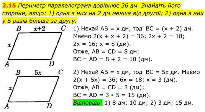 Периметр паралелограма дорівнює 36 дм. Знайдіть його сторони, якщо: 1) одна з них на 2 дм менша від другої; 2) одна з них у 5 разів більша за другу. 1) Нехай AB = х дм, тоді BC = (х + 2) дм. Маємо 2(х + х + 2) = 36; 2х + 2 = 18; 2х = 16; х = 8 (дм). Отже, AB = CD = 8 дм; BC = AD = 8 + 2 = 10 (дм). 2) Нехай AB = х дм, тоді BC = 5х дм. Маємо 2(х + 5х) = 36; 6х = 18; х = 3 (дм). Отже, AB = CD = 3 (дм); BC = AD = 3 • 5 = 15 (дм). Відповідь: 1) 8 дм; 10 дм; 2) 3 дм; 15 дм.