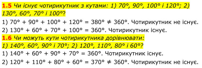 1.5 Чи існує чотирикутник з кутами: 1) 70°, 90°, 100° і 120°; 2) 130°, 60°, 70° і 100°? 1) 70° + 90° + 100° + 120° = 380° ≠ 360°. Чотирикутник не існує. 2) 130° + 60° + 70° + 100° = 360°. Чотирикутник існує. 1.6 Чи можуть кути чотирикутника дорівнювати: 1) 140°, 60°, 90° і 70°; 2) 120°, 110°, 80° і 60°? 1) 140° + 60° + 90° + 70° = 360°. Чотирикутник існує. 2) 120° + 110° + 80° + 60° = 370° ≠ 360°. Чотирикутник не існує.