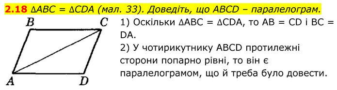 ∆ABC = ∆CDA (мал. 33). Доведіть, що ABCD – паралелограм. 1) Оскільки ∆ABC = ∆CDA, то AB = CD і BC = DA. 2) У чотирикутнику ABCD протилежні сторони попарно рівні, то він є паралелограмом, що й треба було довести.