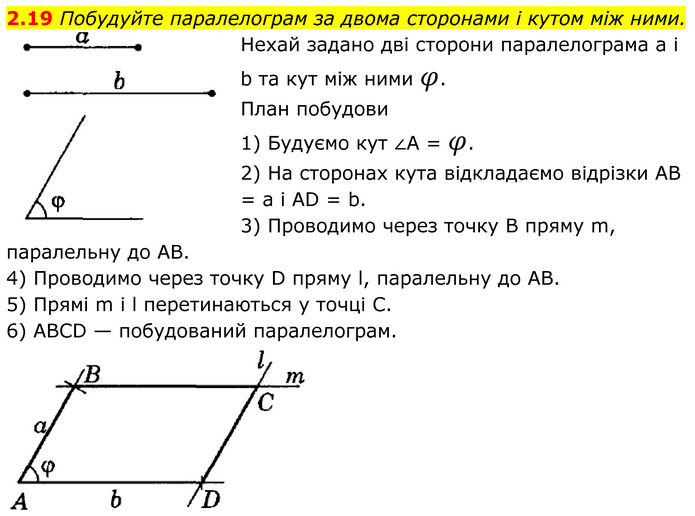 Побудуйте паралелограм за двома сторонами і кутом між ними. Нехай задано дві сторони паралелограма а і b та кут між ними φ. План побудови 1) Будуємо кут ∠A = φ. 2) На сторонах кутa відкладаємо відрізки AB = а і AD = b. 3) Проводимо через точку В пряму m, паралельну до AB. 4) Проводимо через точку D пряму l, паралельну до AB. 5) Прямі m і l перетинаються у точці С. 6) ABCD — побудований паралелограм.