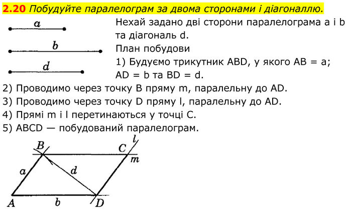 Побудуйте паралелограм за двома сторонами і діагоналлю. Нехай задано дві сторони паралелограма а і b та діагональ d. План побудови 1) Будуємо трикутник ABD, у якого AB = a; AD = b та BD = d. 2) Проводимо через точку В пряму m, паралельну до AD. 3) Проводимо через точку D пряму l, паралельну до AD. 4) Прямі m і l перетинаються у точці С. 5) ABCD — побудований паралелограм.