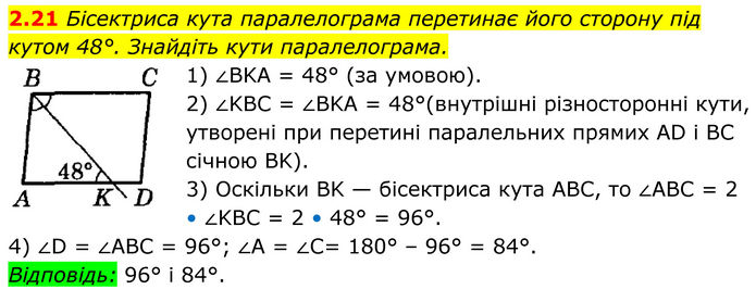 Бісектриса кута паралелограма перетинає його сторону під кутом 48°. Знайдіть кути паралелограма. 1) ∠BKA = 48° (за умовою). 2) ∠KBC = ∠BKA = 48°(внутрішні різносторонні кути, утворені при перетині паралельних прямих AD і BC січною BK). 3) Оскільки BK — бісектриса кута ABC, то ∠ABC = 2 • ∠KBC = 2 • 48° = 96°. 4) ∠D = ∠ABC = 96°; ∠A = ∠C= 180° – 96° = 84°. Відповідь: 96° і 84°.