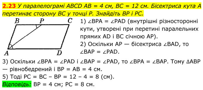 У паралелограмі ABCD AB = 4 см, BC = 12 см. Бісектриса кута A перетинає сторону BC у точці P. Знайдіть BP і PC. 1) ∠BPA = ∠PAD (внутрішні різносторонні кути, утворені при перетині паралельних прямих AD і BC січною АР). 2) Оскільки AP — бісектриса ∠BAD, то ∠BAP = ∠PAD. 3) Оскільки ∠BPA = ∠PAD і ∠BAP = ∠PAD, то ∠BPA = ∠BAP. Тому ∆ABP — рівнобедрений і BP = AB = 4 см. 5) Тоді PC = BC – BP = 12 – 4 = 8 (см). Відповідь: BP = 4 cм; PC = 8 см.