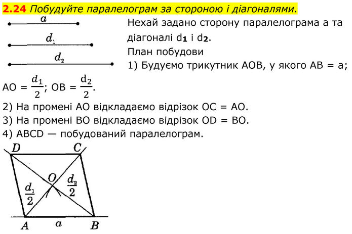Побудуйте паралелограм за стороною і діагоналями. Нехай задано сторону паралелограма а та діагоналі d1 і d2. План побудови 1) Будуємо трикутник АОВ, у якого AB = а; АО = d_1/2; OB = d_2/2. 2) На промені AO відкладаємо відрізок OC = AO. 3) На промені BO відкладаємо відрізок OD = BO. 4) ABCD — побудований паралелограм.