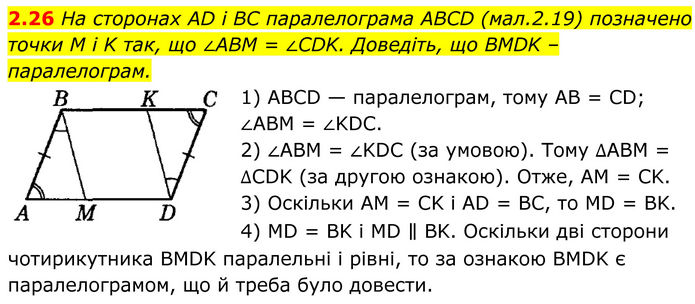На сторонах AD і BC паралелограма ABCD (мал.2.19) позначено точки M і K так, що ∠ABM = ∠CDK. Доведіть, що BMDK – паралелограм. 1) ABCD — паралелограм, тому AB = CD; ∠ABM = ∠KDC. 2) ∠ABM = ∠KDC (за умовою). Тому ∆ABM = ∆CDK (за другою ознакою). Отже, AM = CK. 3) Оскільки AM = CK і AD = BC, то MD = ВK. 4) MD = BK і MD ∥ BK. Оскільки дві сторони чотирикутника BMDK паралельні і рівні, то за ознакою BMDK є паралелограмом, що й треба було довести.